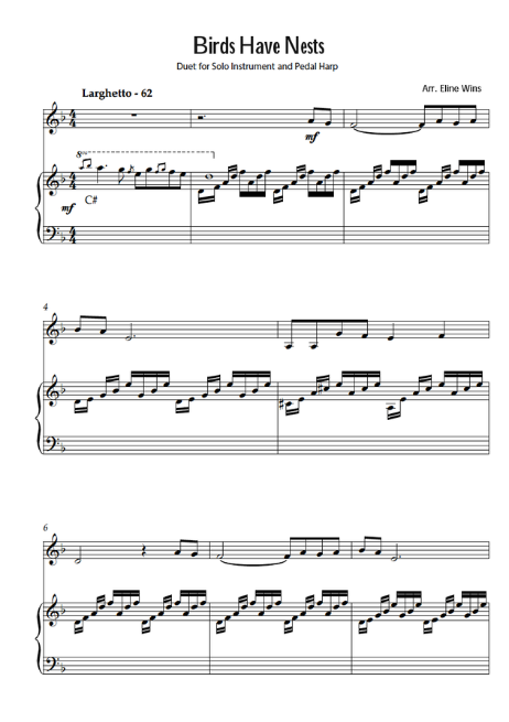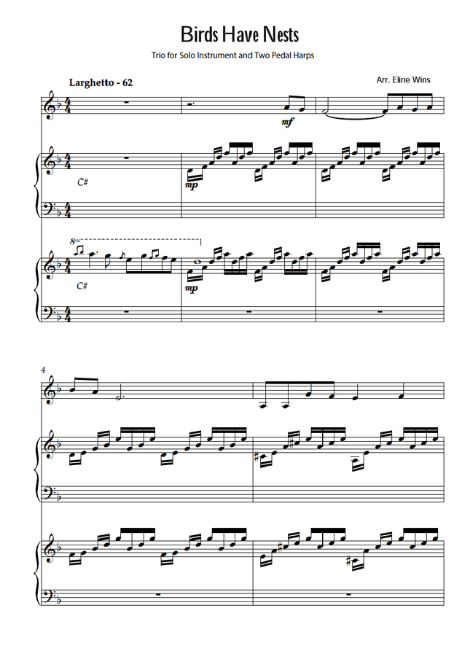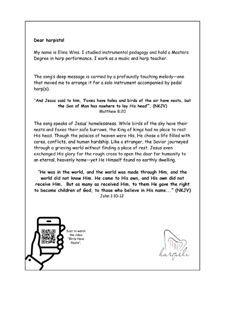 Eline Wins has arranged the song Birds Have Nests for pedal harp duet or trio. The song’s deep message is carried by a profoundly touching melody—one that moved Eline to create this beautiful arrangement.