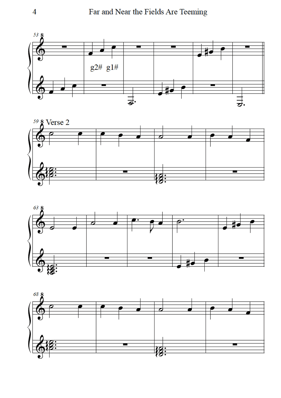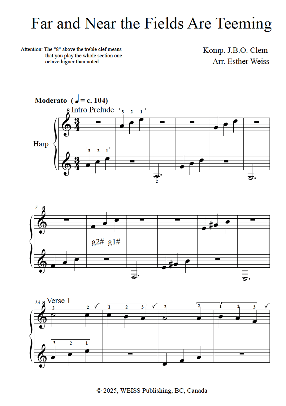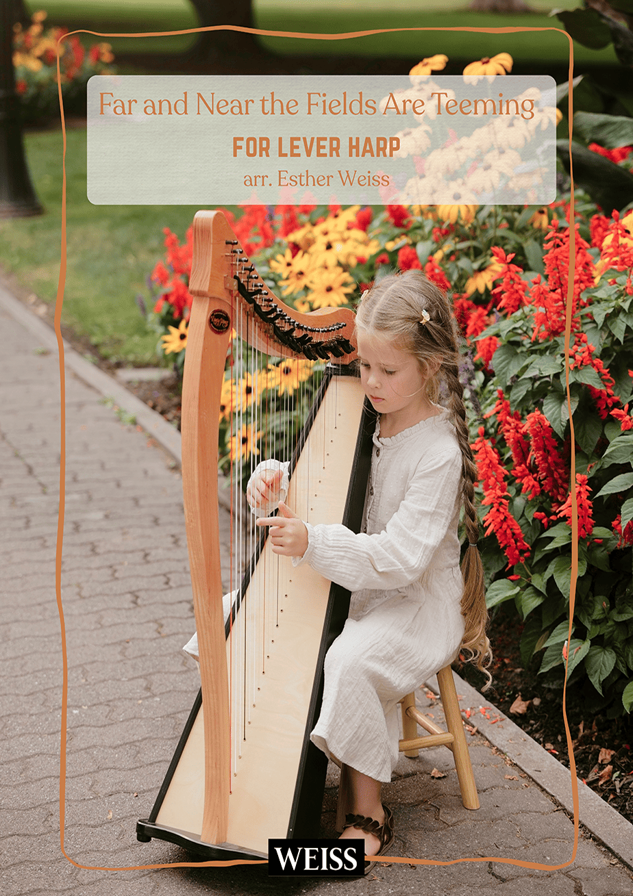 “Far and Near The Fields Are Teeming” composed by J.B.O. Clem and arranged by Esther Weiss, is a simple lever harp piece ideal for church or Thanksgiving. Its gentle, fall-themed melody makes it perfect for seasonal reflection and celebration.
