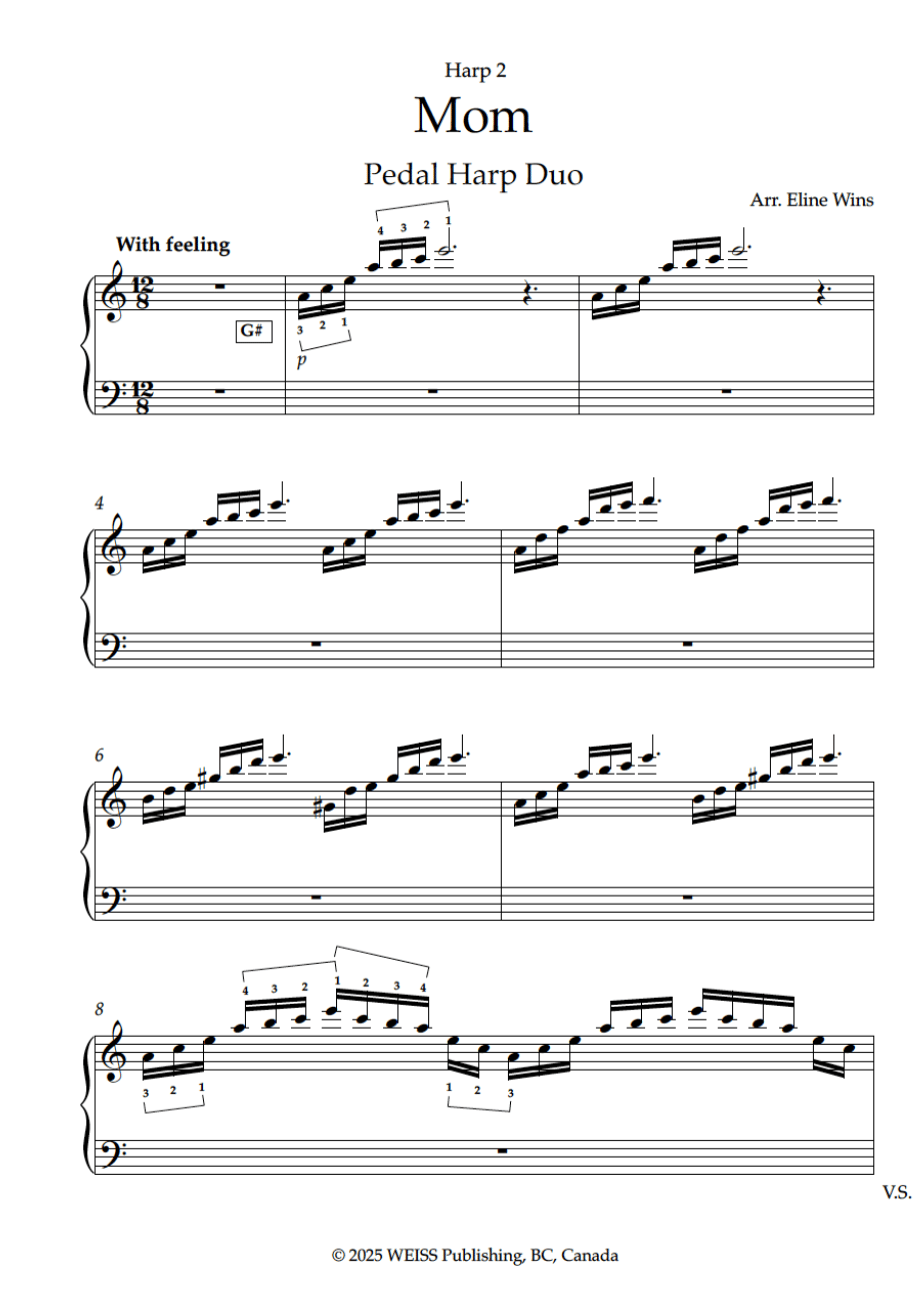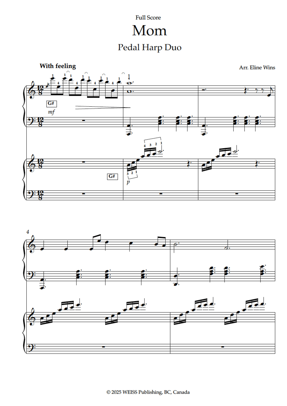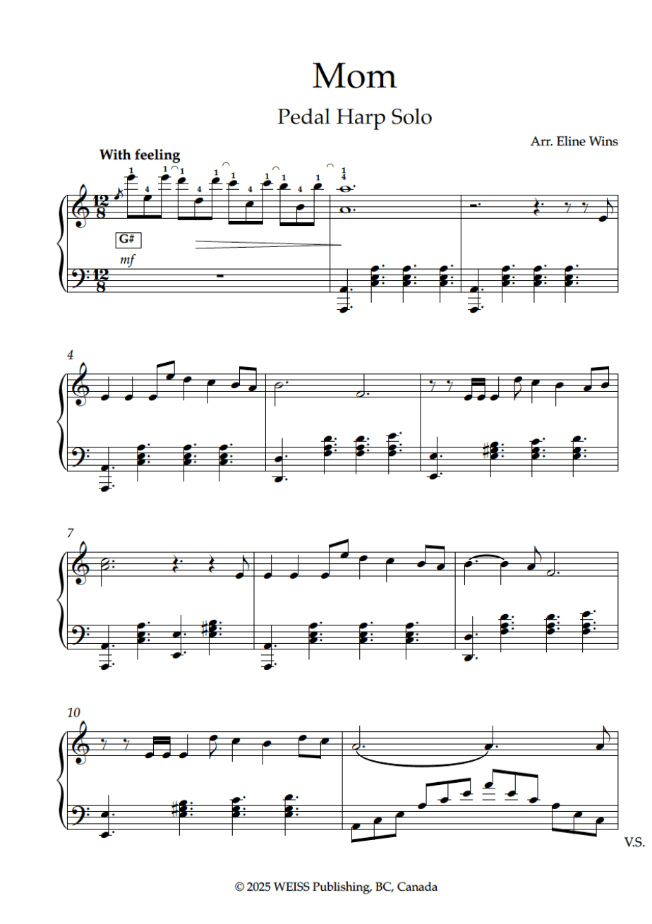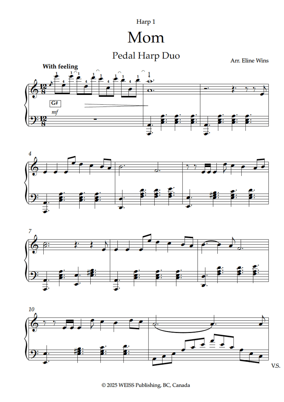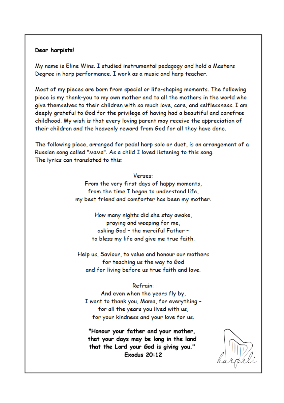 This piece “Mom” is a thank-you to all the mothers in the world who give themselves to their children with so much love, care, and selflessness. The following piece, arranged for pedal harp solo or duet, is an arrangement of a Russian song called “мама” and it could be performed for Mother’s Day.